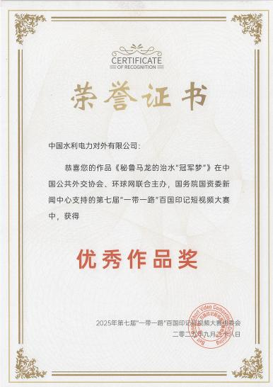 公司作品《秘鲁马龙的治水“冠军梦”》荣获第七届“一带一路”百国印记短视频大赛“优秀作品奖”
